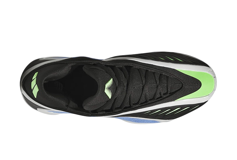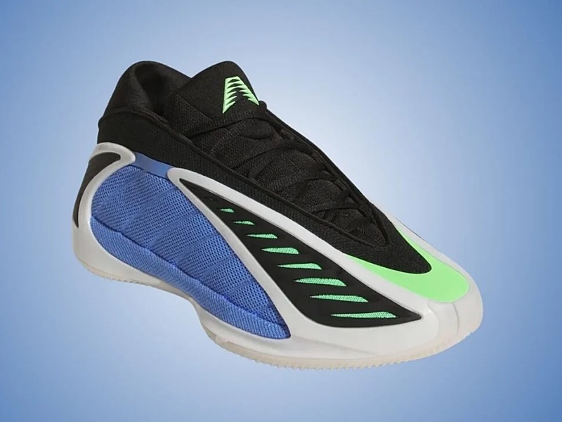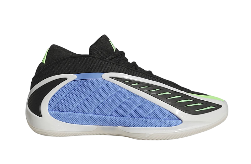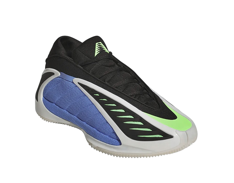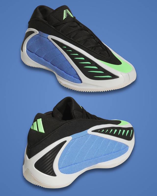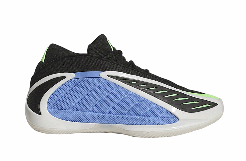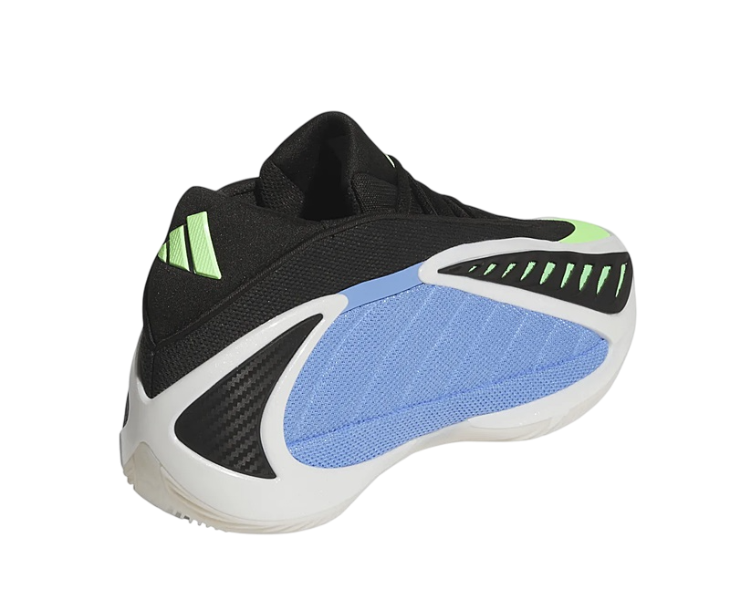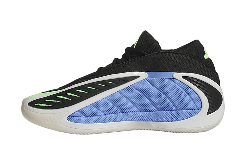 El diseño de las Adidas Anthony Edwards 2 es tan distintivo como su funcionalidad. La combinación de colores Azul Fusión, Zero Metálico y Explosión Lima hacen que este par resalte con fuerza. La malla azul en los paneles y la malla verde bajo la capa de TPU negra no solamente añaden un toque visual llamativo, sino que también mejoran la ventilación del pie gracias a su abertura en la parte superior.