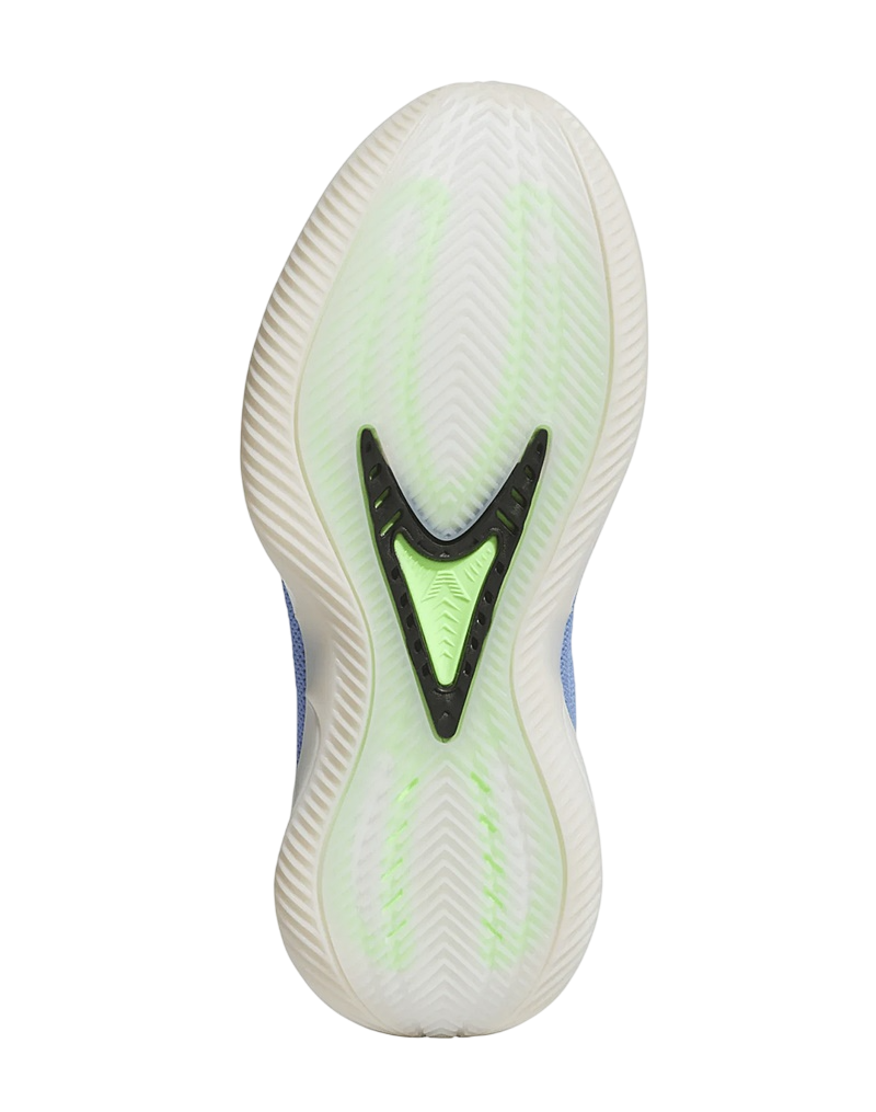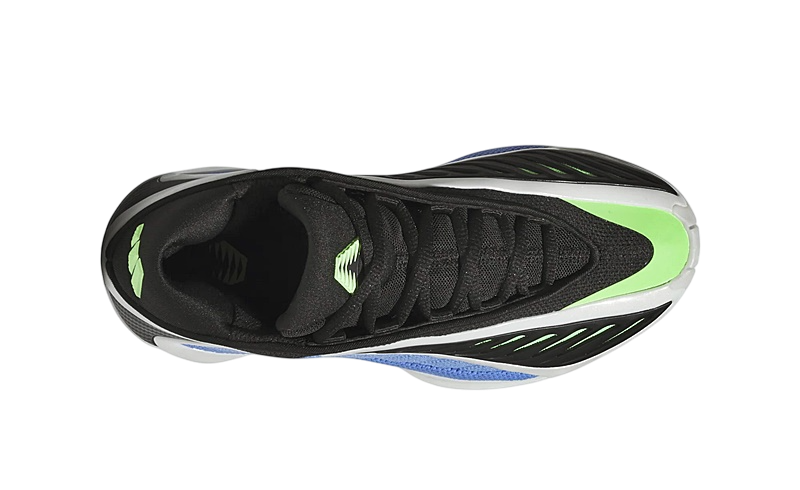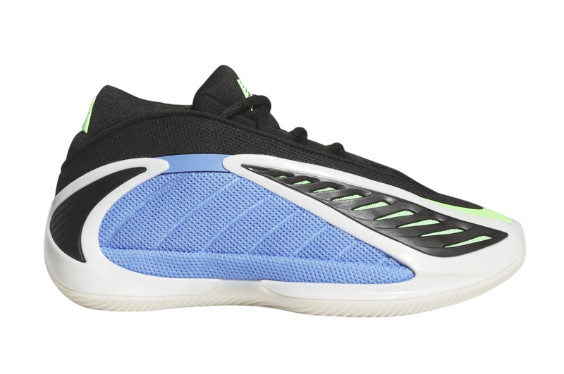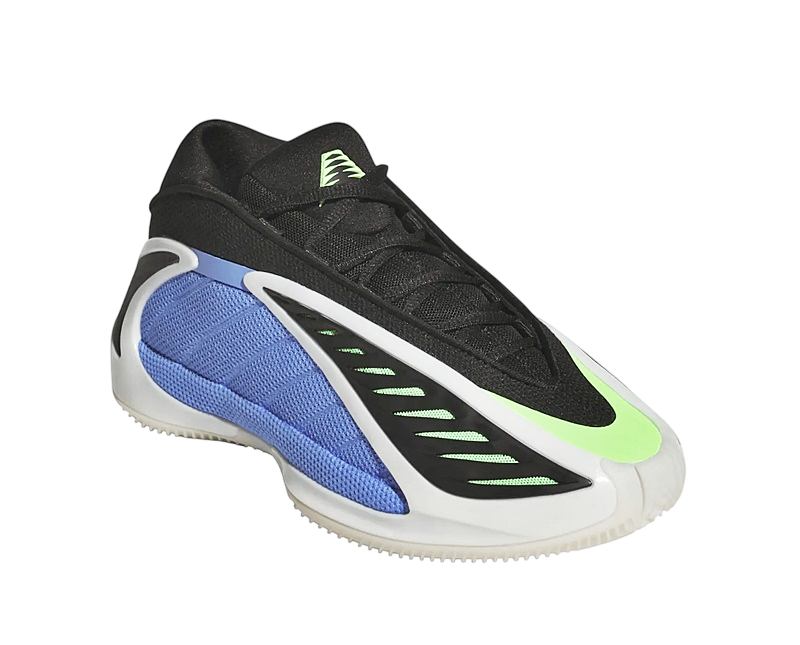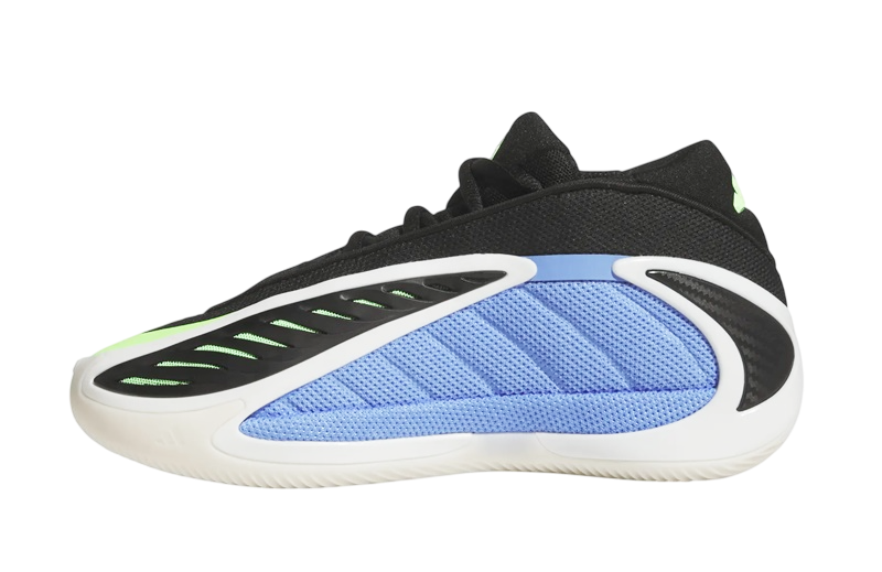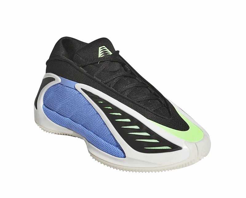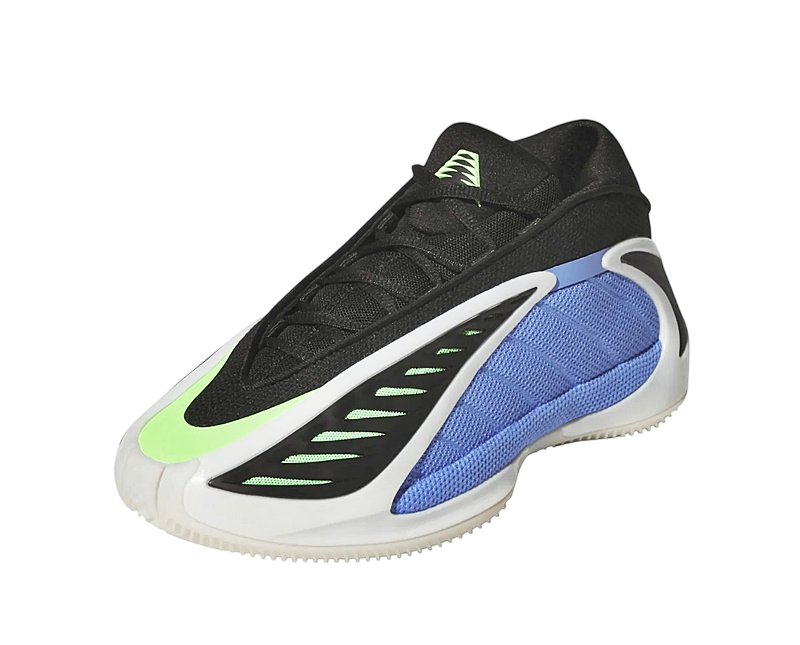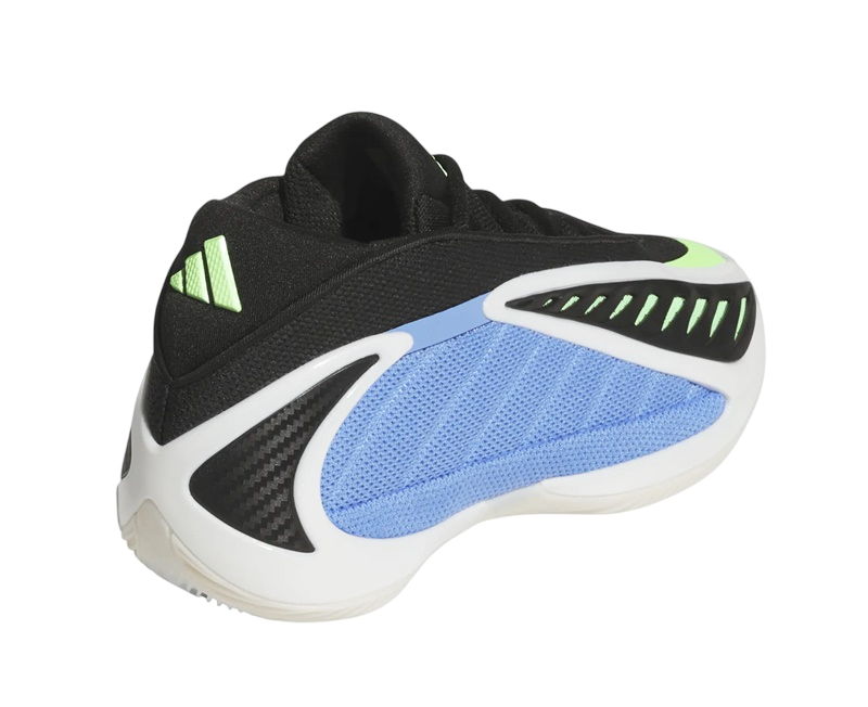 El diseño de las Adidas Anthony Edwards 2 Junior es tan distintivo como su funcionalidad. La combinación de colores Azul Fusión, Zero Metálico y Explosión Lima hacen que este par resalte con fuerza. La malla azul en los paneles y la malla verde bajo la capa de TPU negra no solamente añaden un toque visual llamativo, sino que también mejoran la ventilación del pie gracias a su abertura en la parte superior.