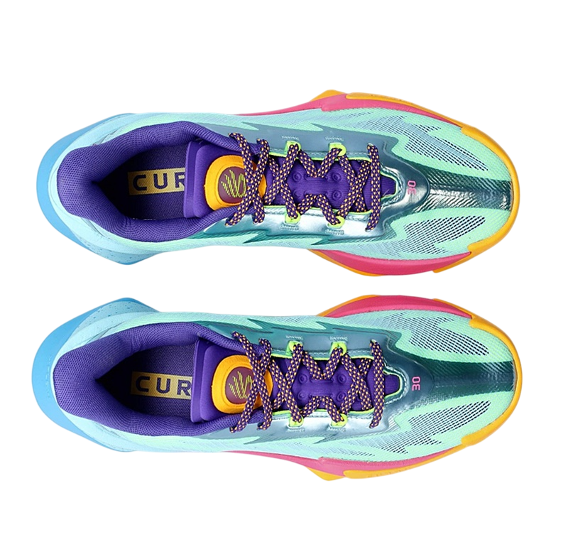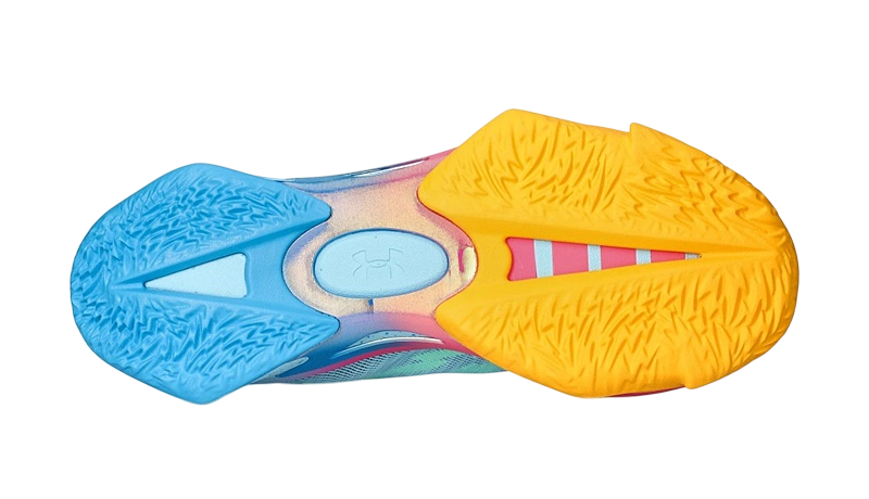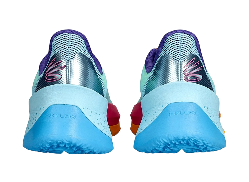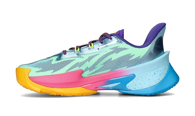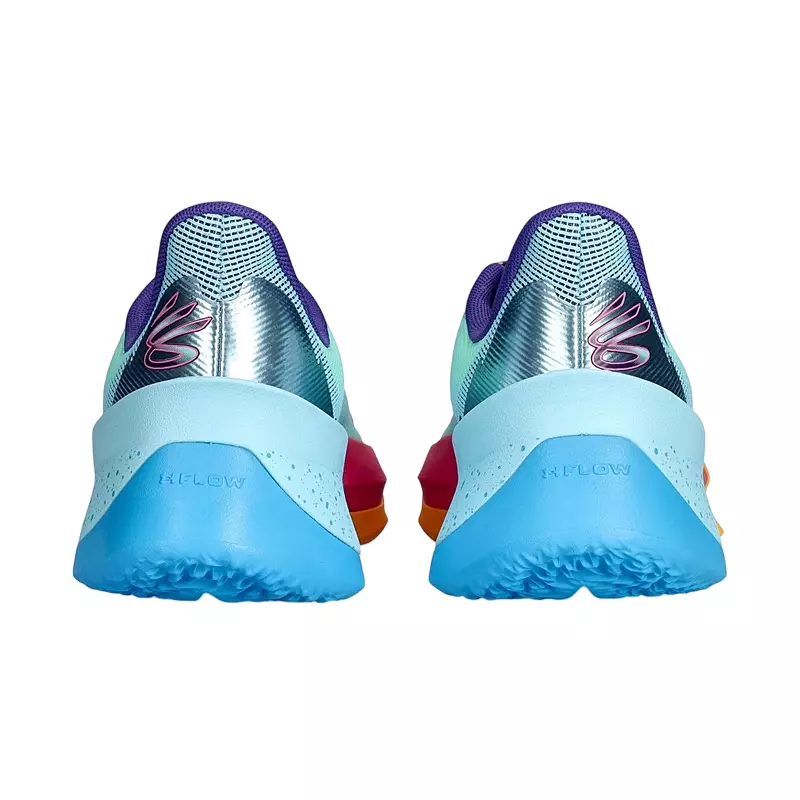 La lengüeta y la plantilla son de color morado oscuro, con un naranja brillante en el logotipo de la marca Curry. La suela es la verdadera estrella de la zapatilla, con un refuerzo naranja en la puntera y el antepié que evoluciona hacia un degradado rosa y azul en el mediopié y el talón, con una sección moteada en la parte trasera. ¡Una maravilla!