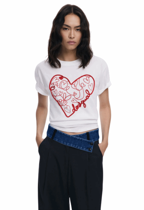 Descubre la elegancia moderna de la camiseta "Desigual T-shirt with embossed hearts "White"". Esta prenda excepcional está diseñada para quienes buscan destacar su estilo único y sofisticado. Confeccionada con materiales de alta calidad, esta camiseta de manga corta presenta un ajuste Regular que se adapta perfectamente a cualquier tipo de cuerpo. Su cuello redondo en color liso aporta un toque clásico, mientras que el detalle en 3D de cordón bordado añade una dimensión extra a su diseño.