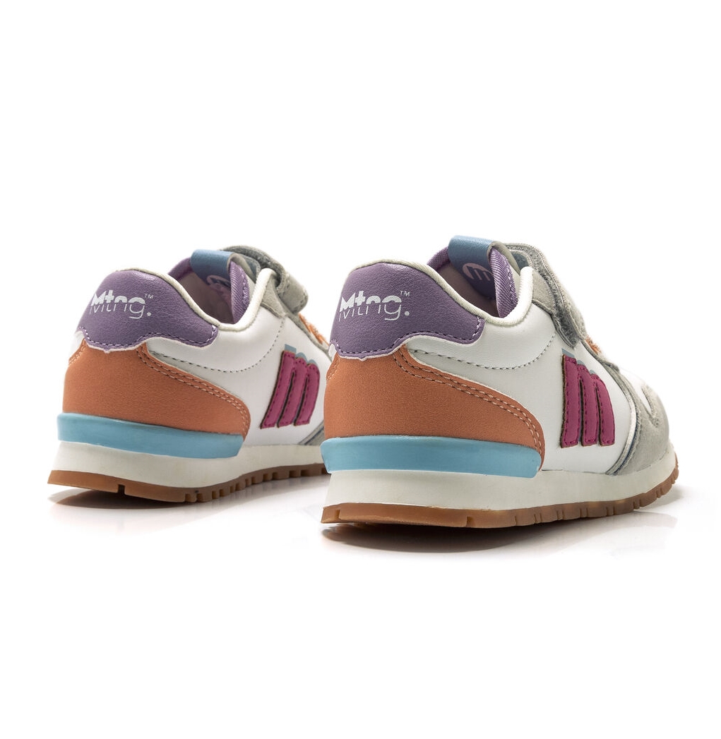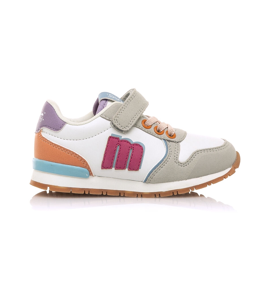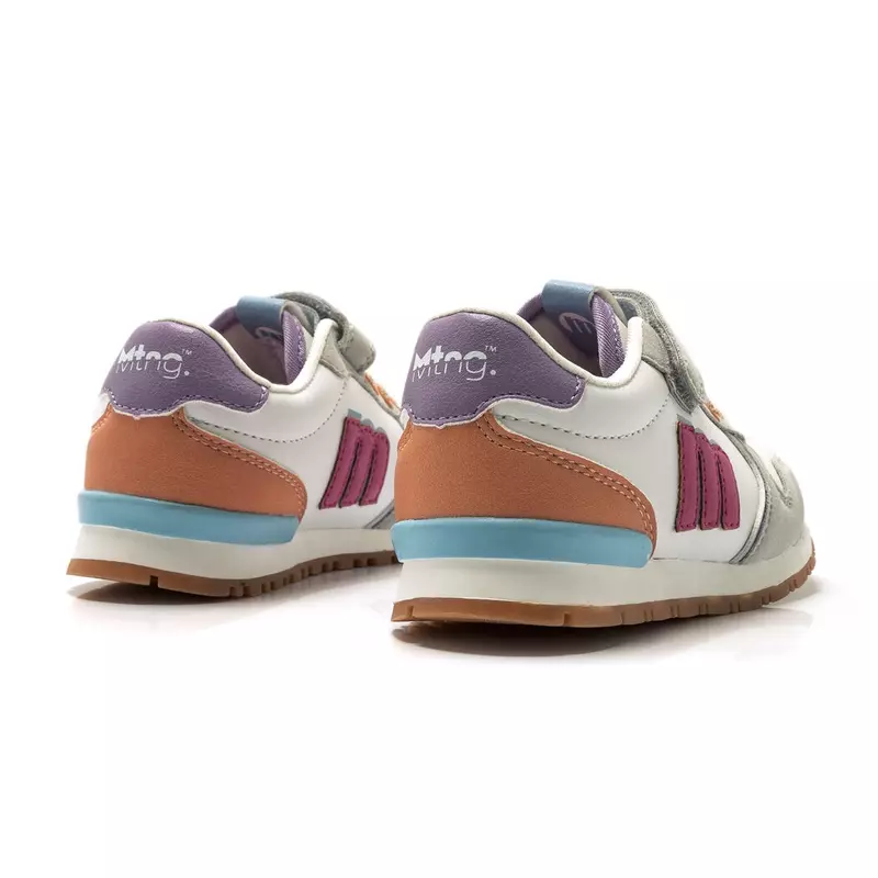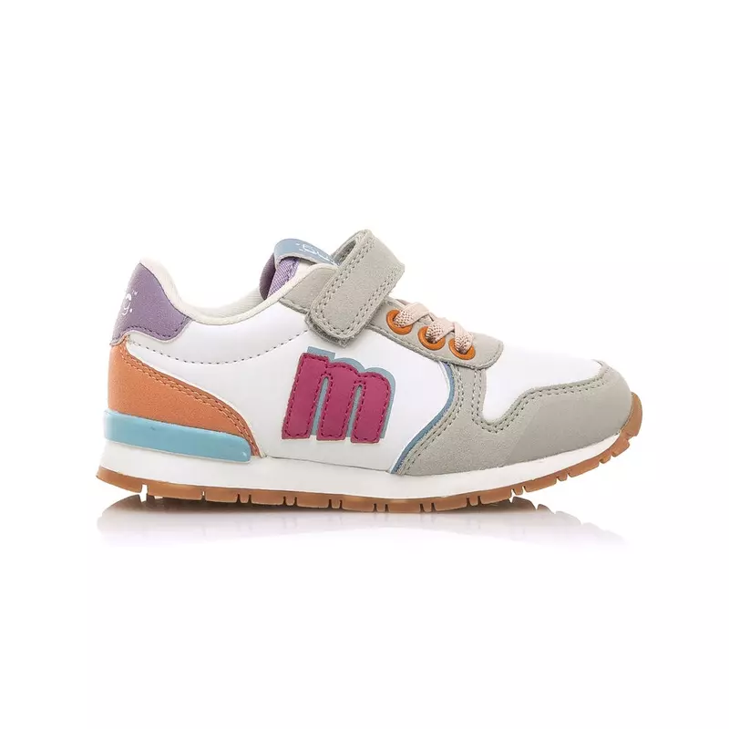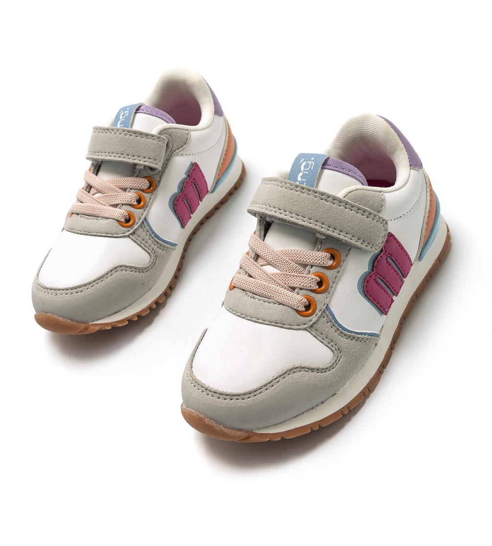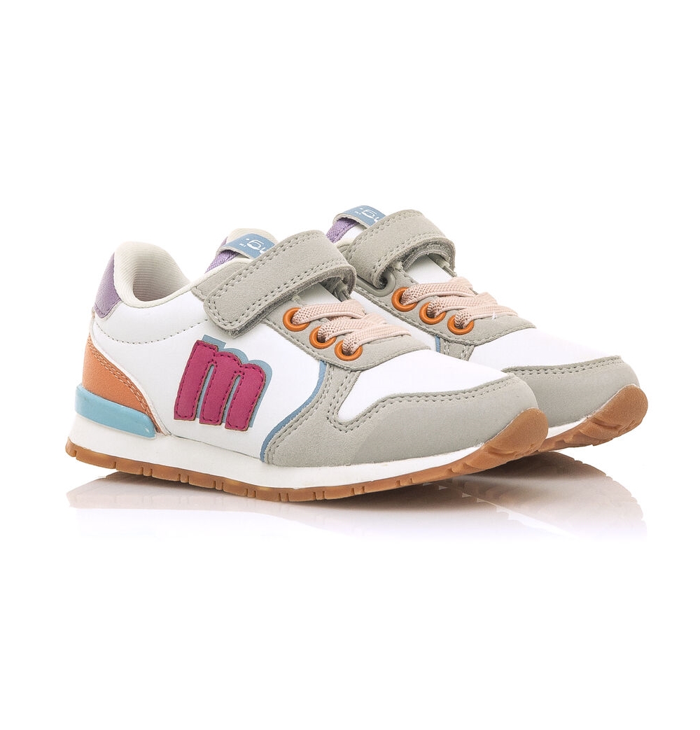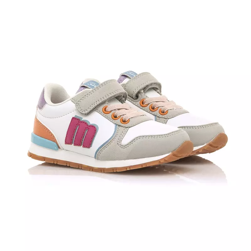 Zapatilla deportiva Joggo Classic Mustang para niños. De color blanco, con detalles de colores pastel. Planta foam. Con diferentes paneles y texturas. Cierre de cordones planos elásticos. Cierre de tira adhesiva en el empeine. Logo de la marca en el lateral en magenta y nombre de la marca en la lengüeta en azul.