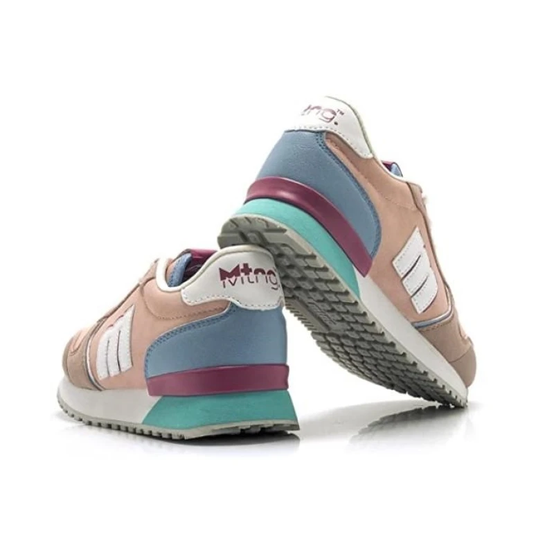 Zapatillas deportivas Joggo de niña de color rosa, combinada en diferentes tonalidades de colores pastel, destacando la combinación en tonos rosas y azules como la trasera y el perfilado del logo de la marca. Tiene cierre de cordones planos y piso bicolor con la puntera ligeramente levantada para mejorar la pisada con planta foam y estabilizador en el talón para mayor estabilidad en la pisada. Da un toque diferente a sus looks comfy con Mustang.