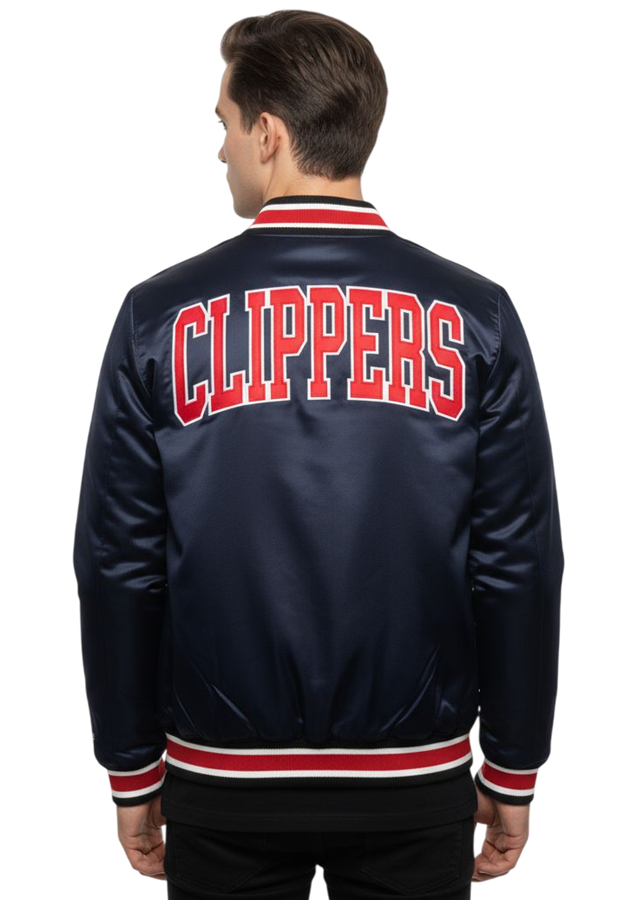 Combina esta chaqueta bomber con unos jeans oscuros y sneakers blancos para un look casual y chic. También puedes optar por unos pantalones cortos y un sombrero de los Clippers para un estilo más deportivo durante los días soleados.