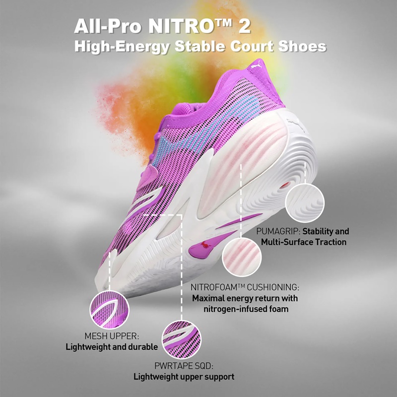 Descubre las revolucionarias Puma All-Pro Nitro™ 2 "Electric Orchid", unas zapatillas de baloncesto de alto rendimiento creadas para mejorar tu juego gracias a la avanzada tecnología de PUMA Hoops.